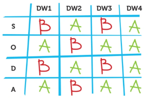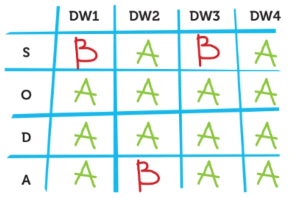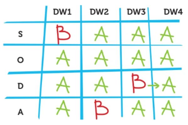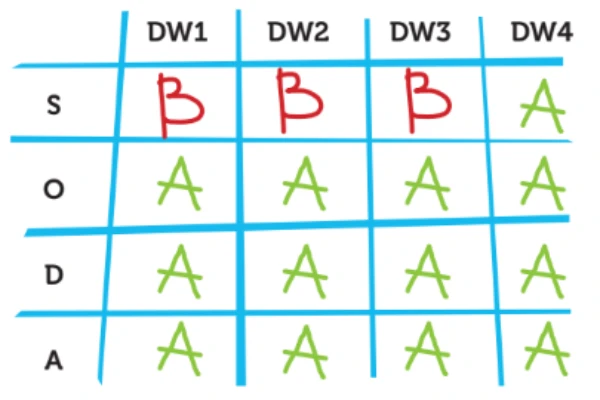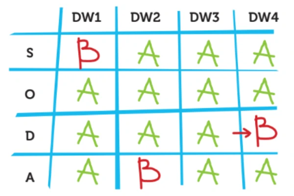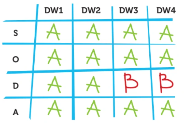 Je 1 B-score krijgt op het onderdeel “dagelijks werk in periode 4” (DW4). Een B-score op DW4 betekent een negatieve evolutie. Bij twijfel beslist de klassenraad of je het SODA-attest verdient.
