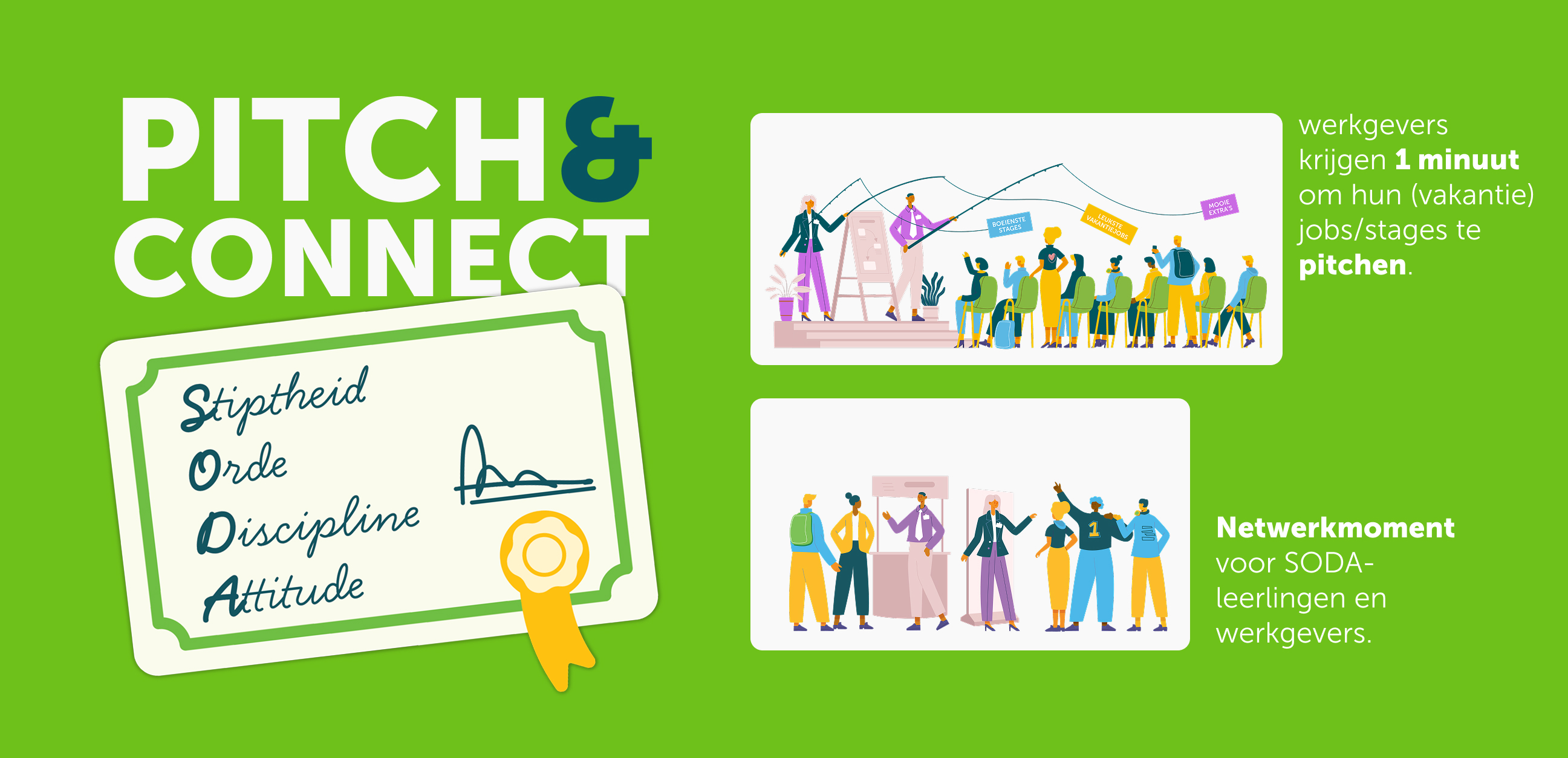 Bent u als werkgever op zoek naar betrouwbare en gemotiveerde schoolverlaters? Ieder jaar organiseren we met onze SODA-scholen de Pitch & Connect - netwerkevents. Dit exclusieve jobevent biedt u de kans om in contact te komen met jonge talenten die zich onderscheiden door hun stiptheid, werkethiek en motivatie.