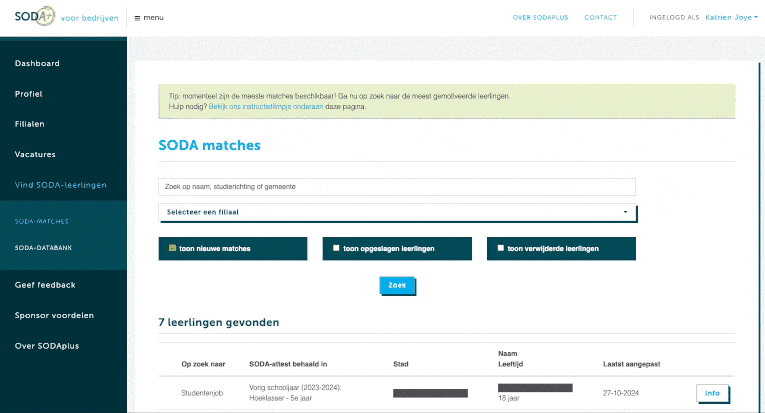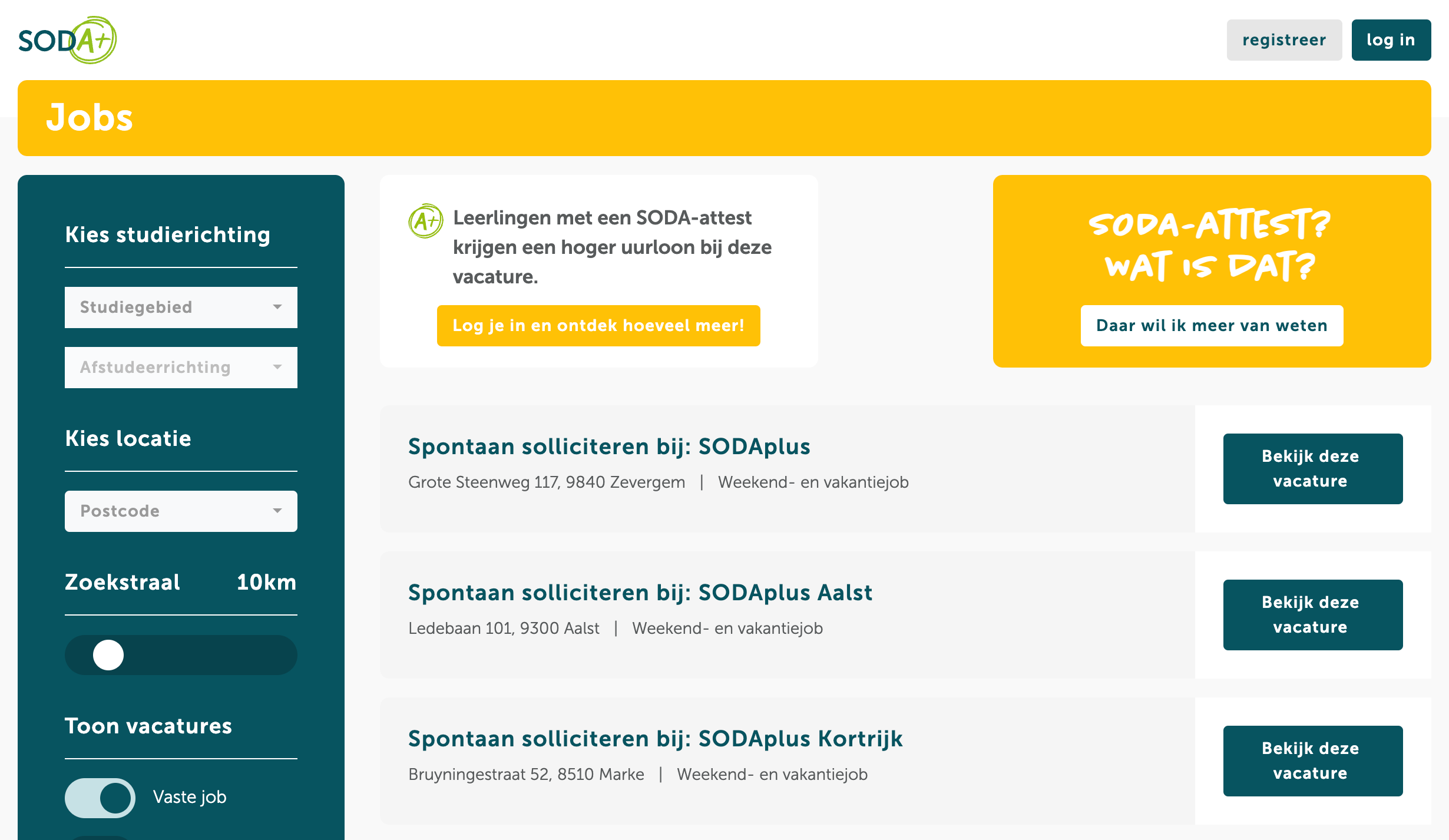 Word gematcht met SODA-leerlingen die in de buurt wonen en voldoen aan jouw ingestelde criteria zoals: studierichtingen, leeftijd of dat ze NU op zoek zijn naar een (vakantie)job of stage.